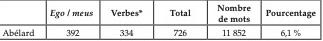 * Pour Abélard, comme pour Sedulius, j’ai aussi tenu compte des emplois de nos / noster et des verbes conjugués à la 1re personne du pluriel dans les cas, fréquents, où ce "nous" n’est qu’une variante littéraire du "je". Dhuoda en revanche ne connaît guère cet emploi du "nous de majesté".
