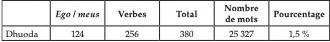Pour mesurer la dimension "autobiographique" de ces deux longs passages que je viens de citer, il est intéressant de refaire dans ces seules pages le même relevé que plus haut. Les marques de première personne y sont d’une importance exceptionnelle, dépassant même les pourcentages observés chez Abélard :