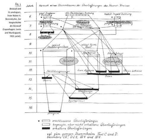 The classic discussion of the Scylding analogues is Axel Olrik’s magisterial The Heroic Legends of Denmark(9). Most of them were brought together conveniently by R. W. Chambers in Beowulf : An Introduction to the Study of the Poem(10), then in Frederick Klaeber’s editions(11). Many are translated in G. N. Garmonsway and Jacqueline Simpson’s Beowulf and Its Analogues(12), and three new collections with translations have appeared, in ANQ’s Beowulf Theme Issue (13), John Niles’s Beowulf and Lejre (14), and the new edition of Klaeber (15). The analogues are easily accessible, then, but we should not underestimate the complexity of their relations to one another and to Beowulf. A chart in Walter Berendsohn’s Zur Vorgeschichte des Beowulf (16) bravely attempts to map them (vertically from the sixth to the sixteenth centuries, horizontally as they pass through Gautland, Denmark, Germany, England, and Iceland.